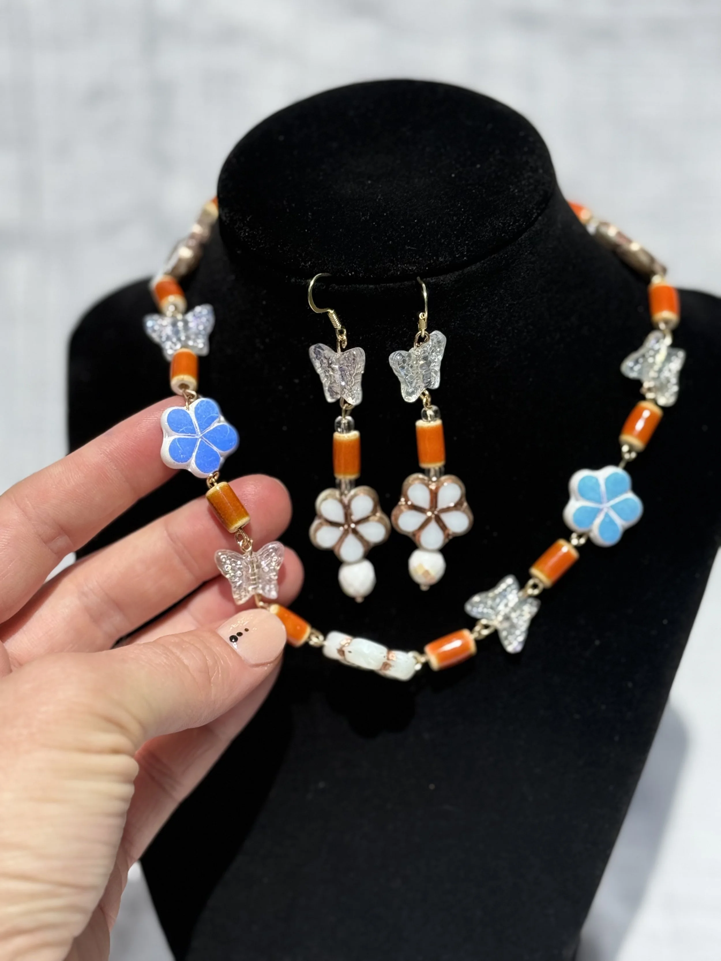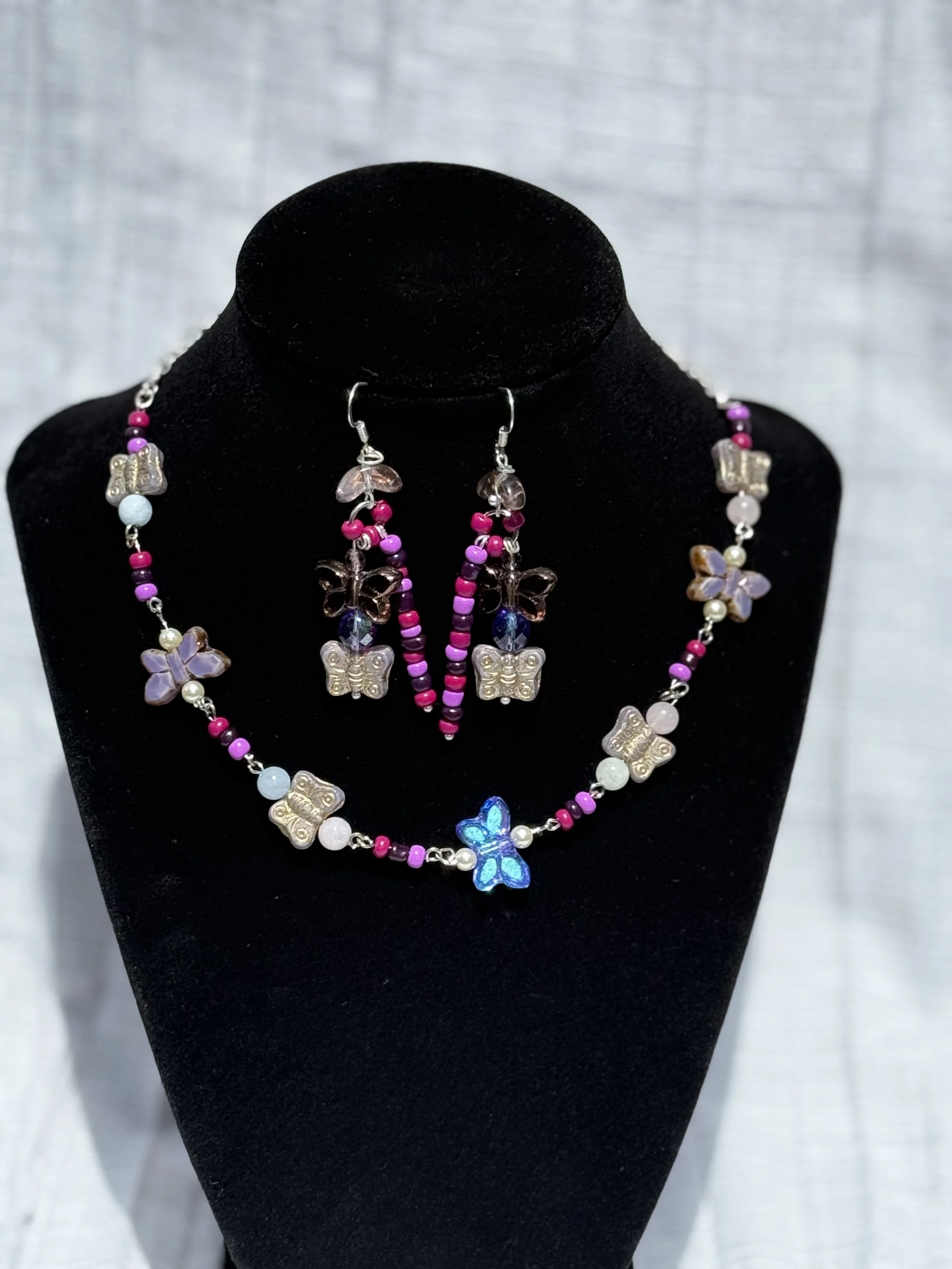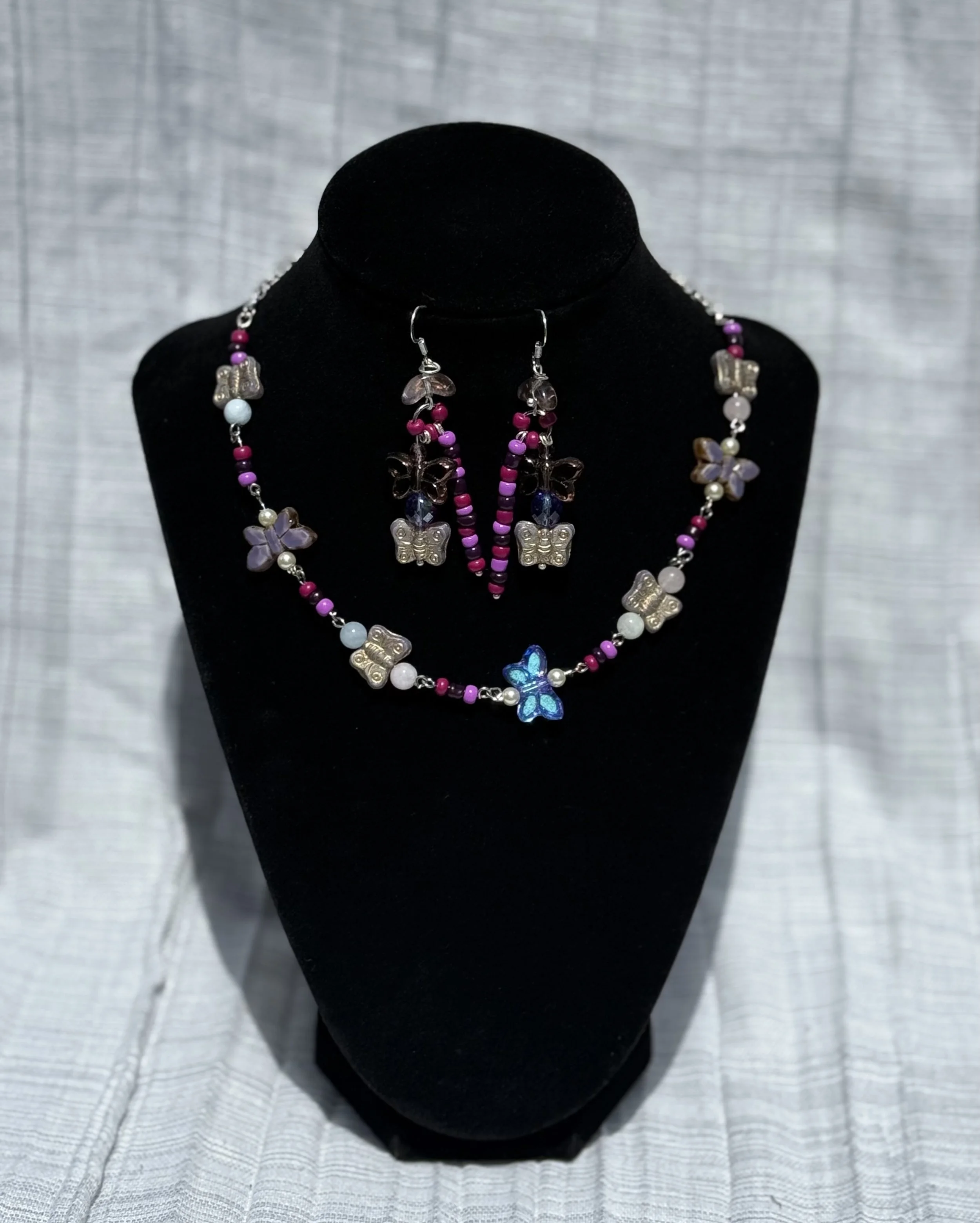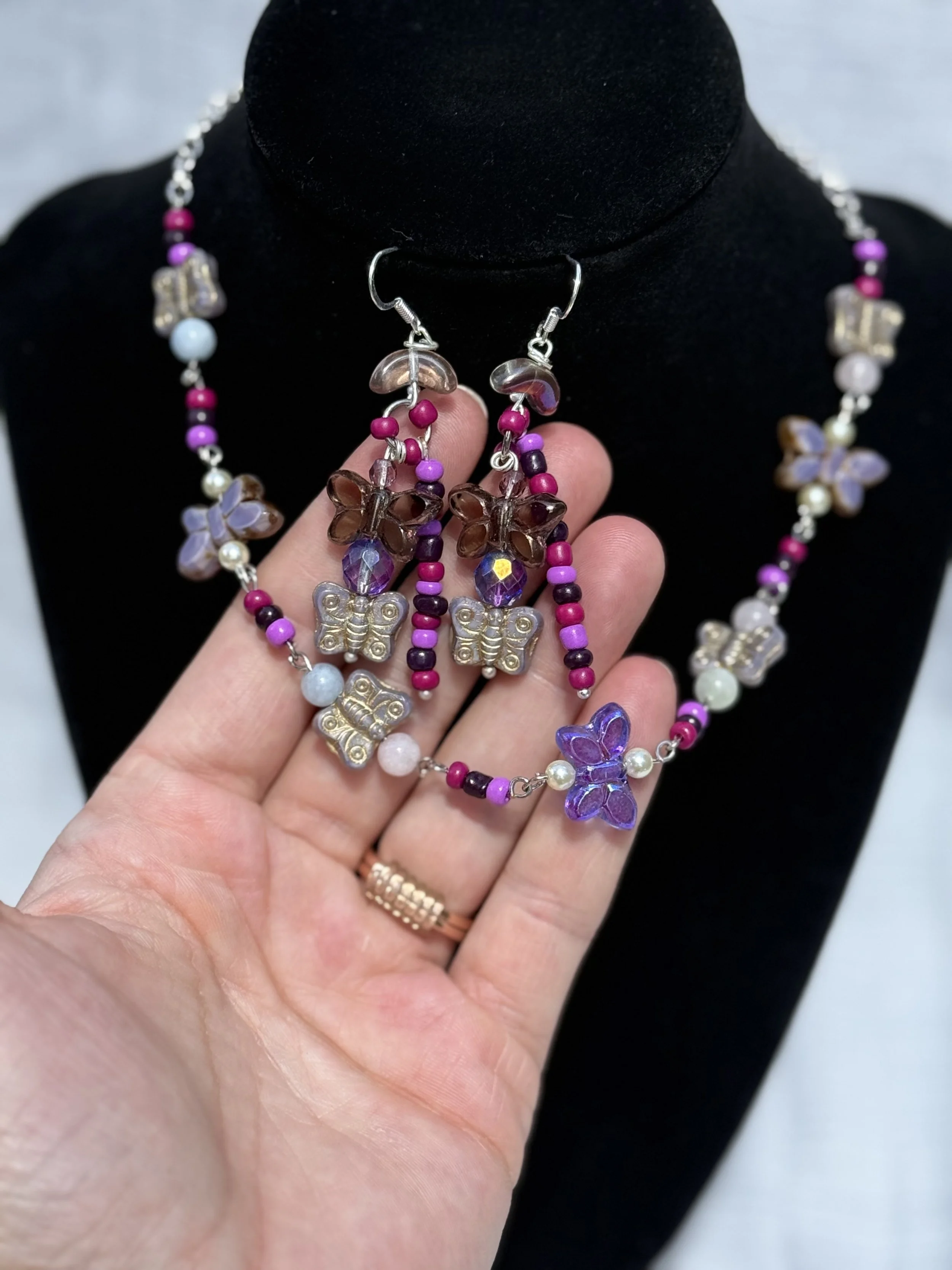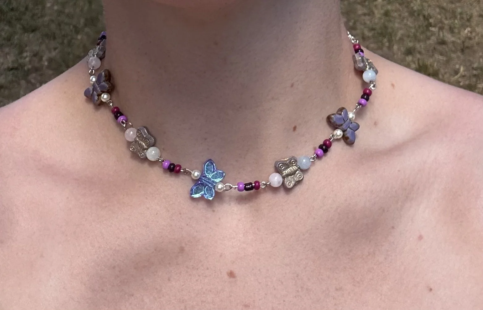 This delicate double-layered necklace captures the feeling of a quiet, graceful descent. Featuring larger iridescent butterflies that catch the light with every move and smaller butterflies in alternating shades of blue and purple, it brings a soft, dreamy energy to any outfit. The silver-toned chain adds just the right touch of shimmer, making this piece a gentle standout—perfect for layering or wearing solo when you want a little magic close to your heart.